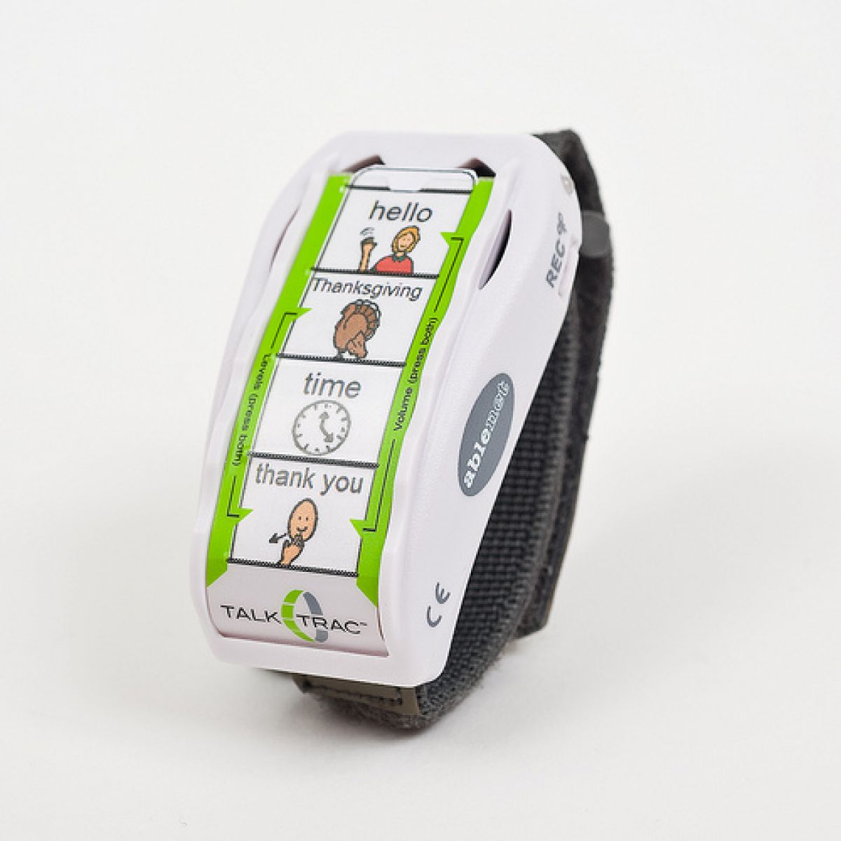 De TalkTrac Communicator is een eenvoudige communicator met polsband. Hij heeft 2 niveaus en 4 toetsen waaronder spraakboodschappen kunnen worden opgenomen. Een polsband, 5 blanco overlays en een batterijlader worden standaard meegeleverd.