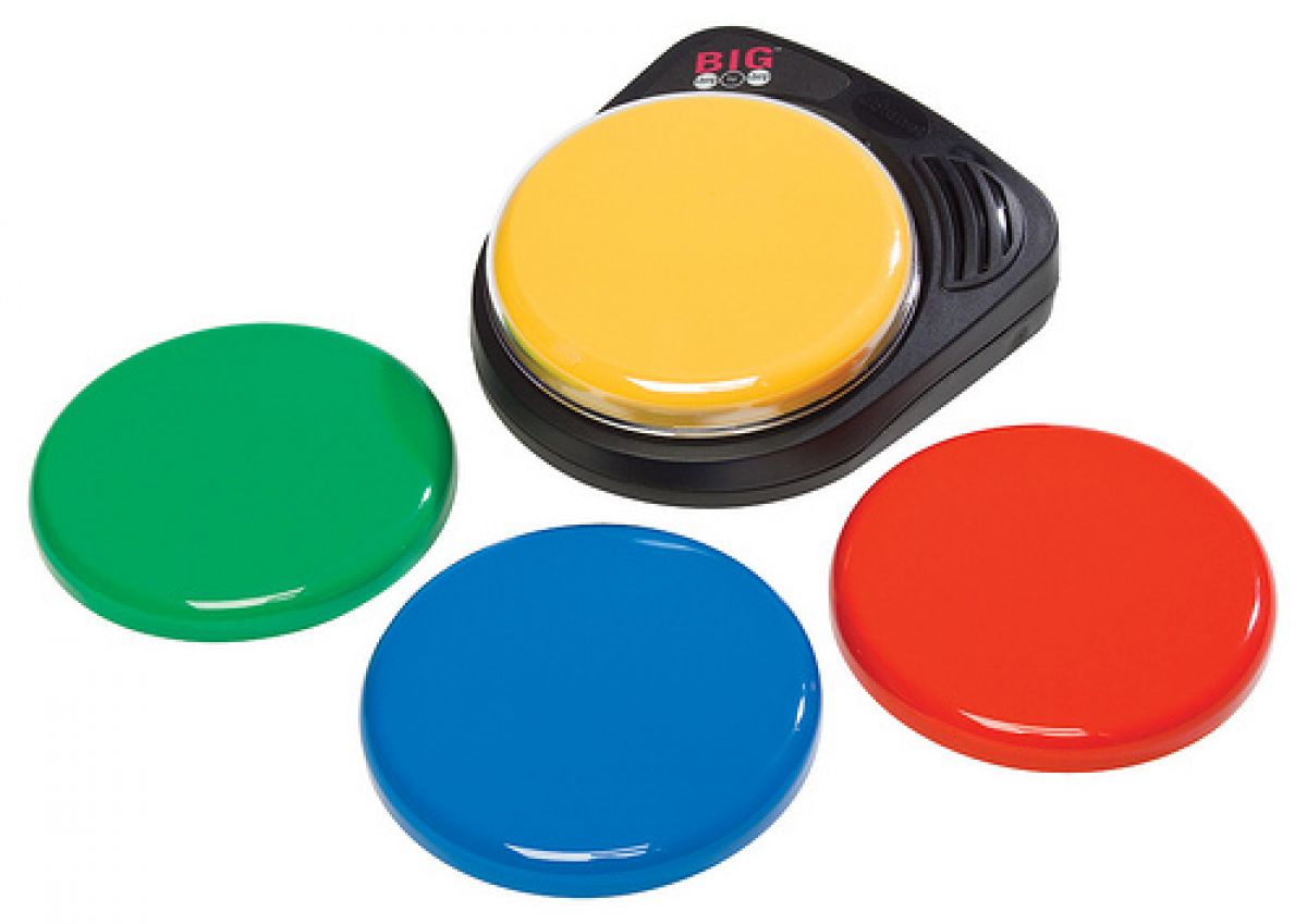 De BIG Step-by-Step communicator is één grote schakelaar voor meerdere spraakboodschappen. Hij wordt geleverd met verwisselbare kapjes in de kleuren rood, geel, groen en blauw. Daarnaast wordt een doorzichtig kapje meegeleverd, dat op het gekleurde kapje kan worden geplaatst, met een symbool of pictogram eronder.