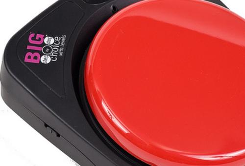 De BIG Step-by-Step Choice with Levels is één grote schakelaar voor meerdere spraakboodschappen, met keuzefunctie. Hij wordt geleverd met verwisselbare kapjes in de kleuren rood, geel, groen en blauw. Daarnaast wordt een doorzichtig kapje meegeleverd, dat op het gekleurde kapje kan worden geplaatst, met een symbool of pictogram eronder.