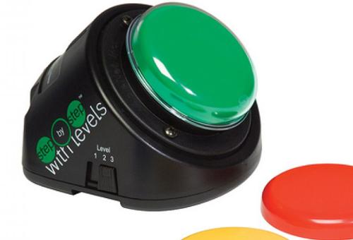 De BIG Step-by-Step with Levels is één grote schakelaar met drie niveaus en meerdere spraakboodschappen per niveau. Hij wordt geleverd met verwisselbare kapjes in de kleuren rood, geel, groen en blauw. Daarnaast wordt een doorzichtig kapje meegeleverd, dat op het gekleurde kapje kan worden geplaatst, met een symbool of pictogram eronder.