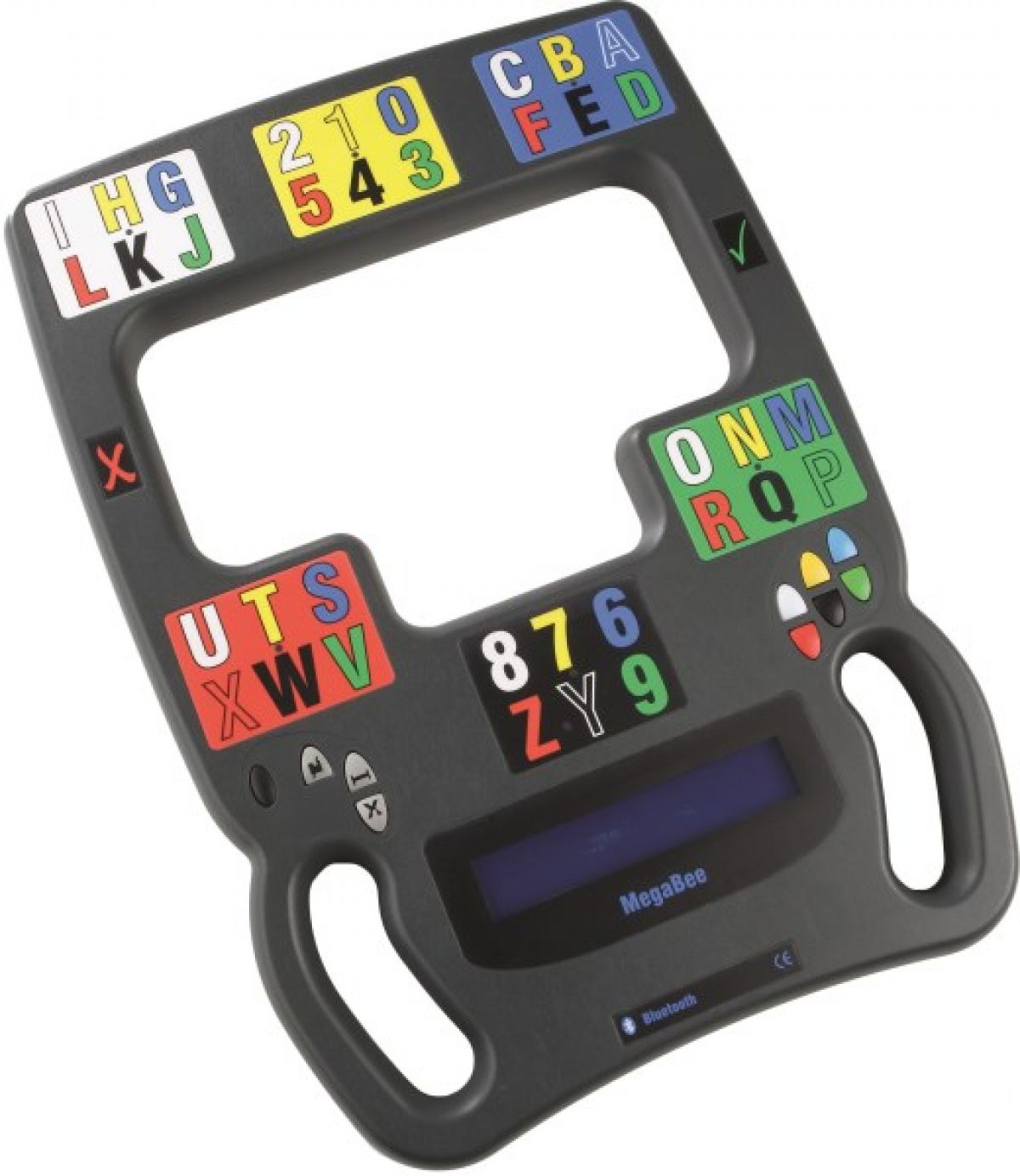 De MegaBee is een tekst-gebaseerd doorkijkraam met display. Op de rand staan gekleurde letters afgebeeld in gekleurde vakken. Het raam heeft handvaten waarmee de gesprekspartner het hulpmiddel kan vasthouden. Met behulp van knopjes die direct boven de handvaten zijn geplaatst, selecteert hij/zij de letters waarnaar de patiënt kijkt. Het display geeft feedback over de gekozen letters.