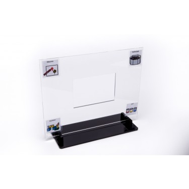 De Doorkijkraam is voorzien van magneetknijpers/klittenband. Met behulp van deze magneetknijpers/klittenband kunnen bijvoorbeeld symbolen of foto’s aan het raam worden gehangen. Er kunnen ook kleine voorwerpen erop worden geplaatst. Door in de richting van het symbool of voorwerp te kijken kan het kind communiceren met iemand die voor het kind plaatsneemt. Om rechtstreeks oogcontact te kunnen houden is er een uitsparing in het midden. Het raamwerk wordt rechtop geplaatst in een tafelsteun.