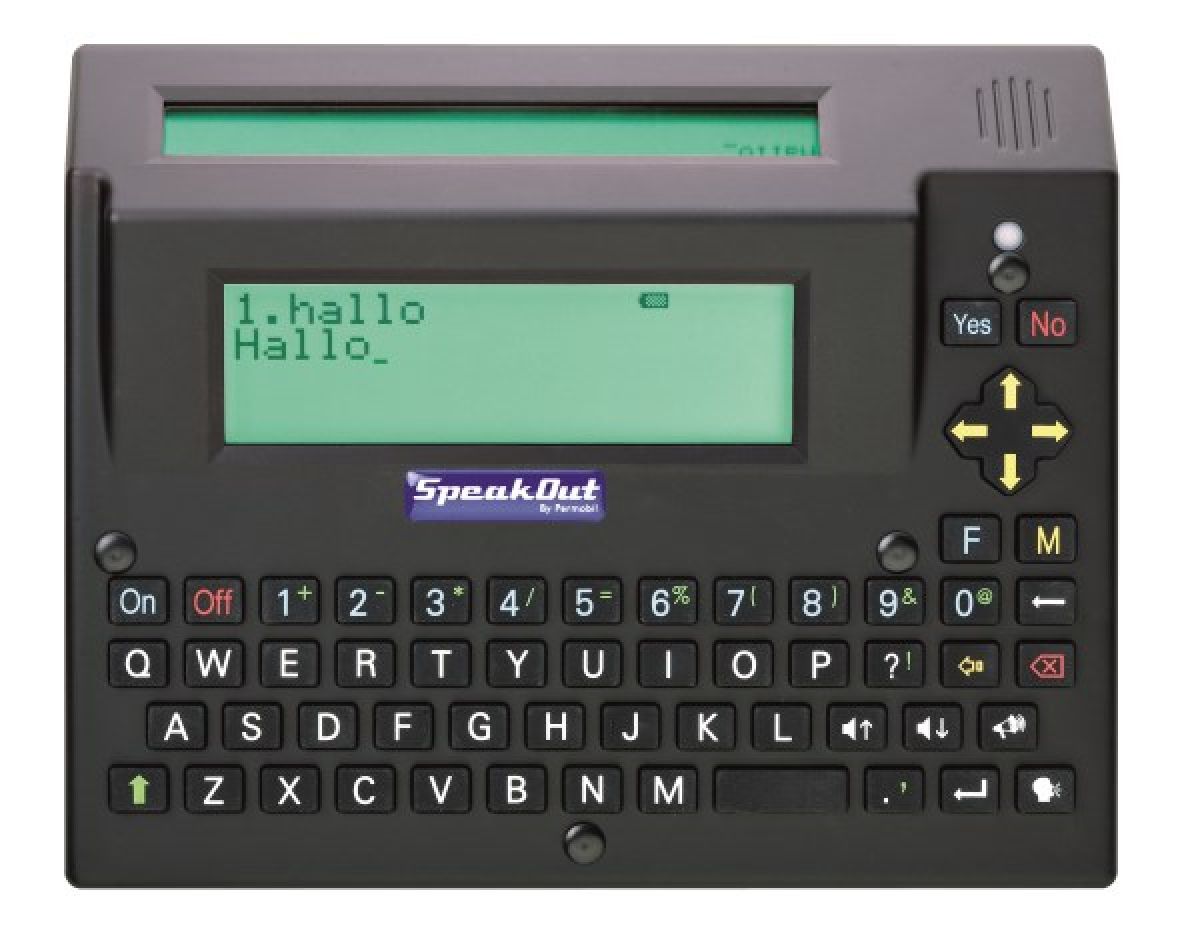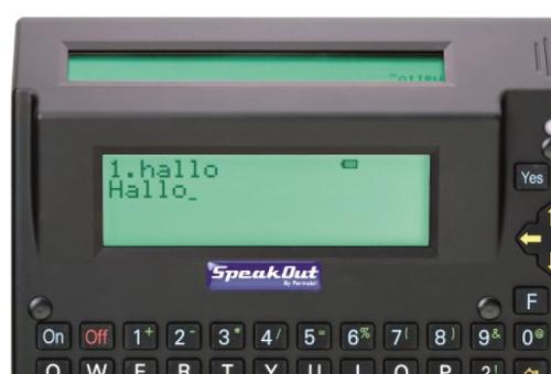 De SpeakOut is een tekst-gebaseerd communicatiehulpmiddel met twee leesregels en synthetische spraak.